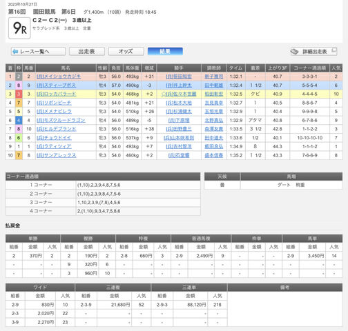 三連複は59.8%、三連単のみで見ると8月は三連単100万馬券2本含めて回収率700.7%を叩き出しましたが、9月はまさかの大敗で16.0%という衝撃的な数字。。