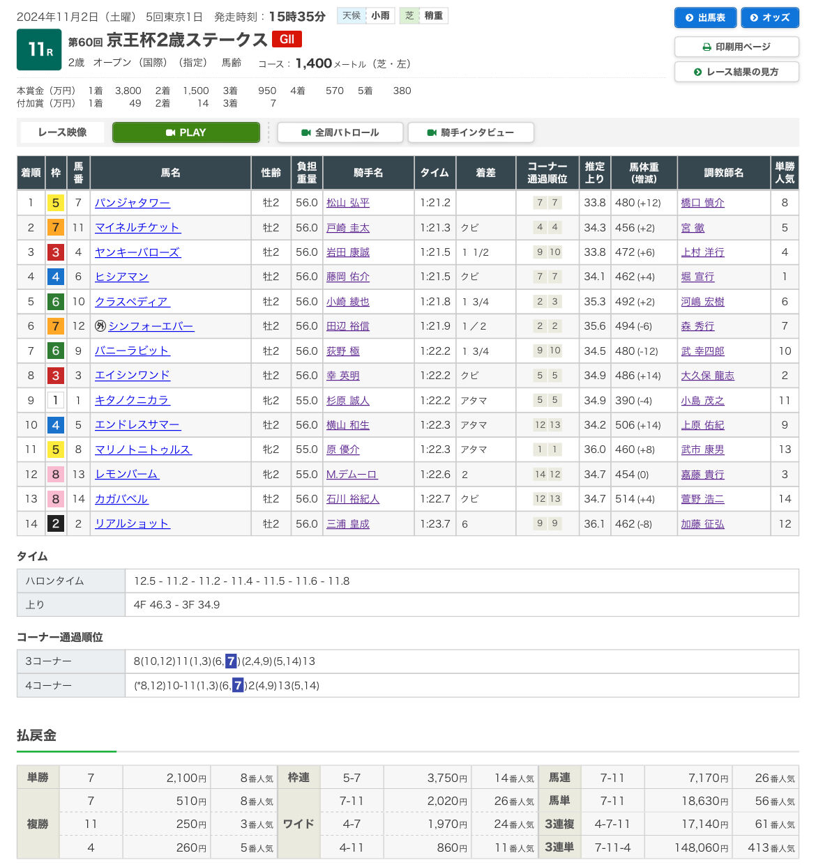 京王杯2歳ステークスは穴軸8番人気のパンジャタワーから三連単もGET👍👍