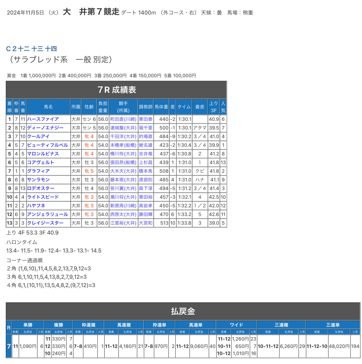 11/7の南関競馬は大井競馬場でトパーズ賞2024が開催されます。